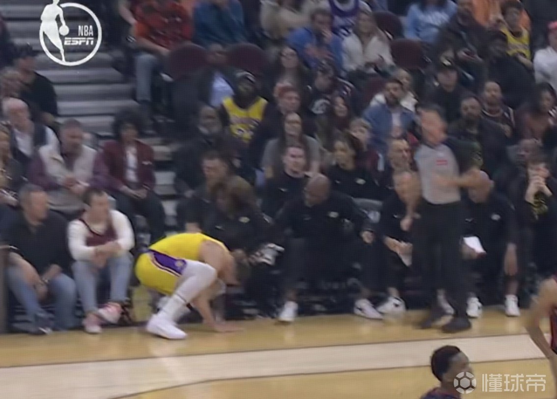 比赛第一节,湖人球员东契奇投篮后撤的过程中踩到了骑士主场地板的边缘,一脚踩空导致崴脚,之后返回了更衣室。