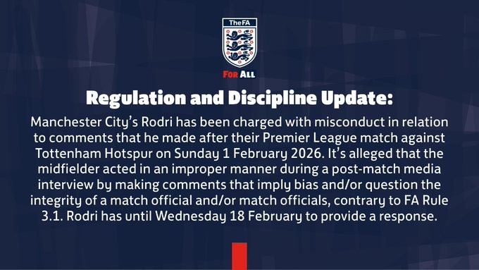 罗德里因在2026年2月1日与热刺的英超比赛后发表的言论而被指控行为不当,据称,他在赛后媒体采访中发表了暗示偏见和/或质疑比赛官员和/或比赛官员公正性的言论,这违反了英足总规则3.1,罗德里需在2月18日之前作出回应。(公告完)
