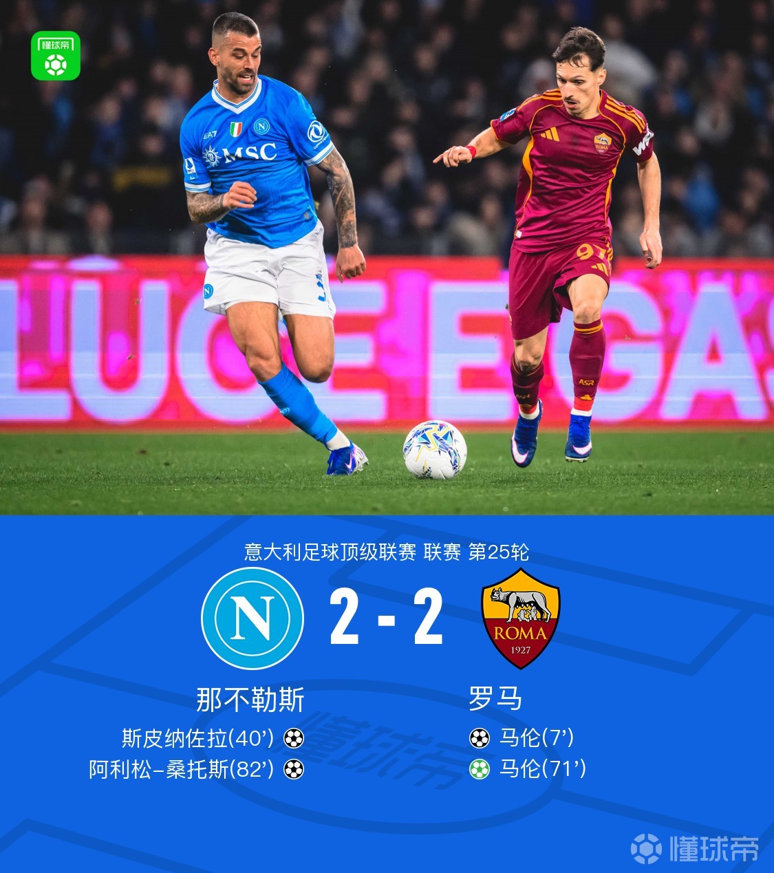 那不勒斯2-2罗马,马伦双响,斯皮纳佐拉破旧主,阿利松破门