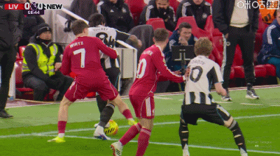 第12分钟,戈登抢球铲倒阿利松,被裁判黄牌警告