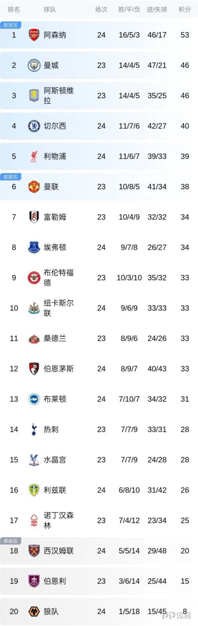 英超积分榜:阿森纳赢球7分领跑 曼城将客战热刺