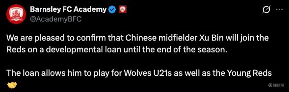 官方公告显示徐彬加盟的是巴恩斯利U21,并将同时效力狼队U21