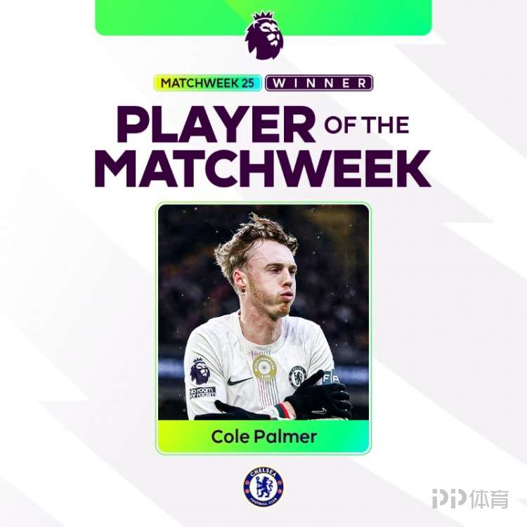 英超第25轮比赛,帕尔默打进3球,帮助切尔西客场3-1击败狼队,他当选本轮英超最佳球员。